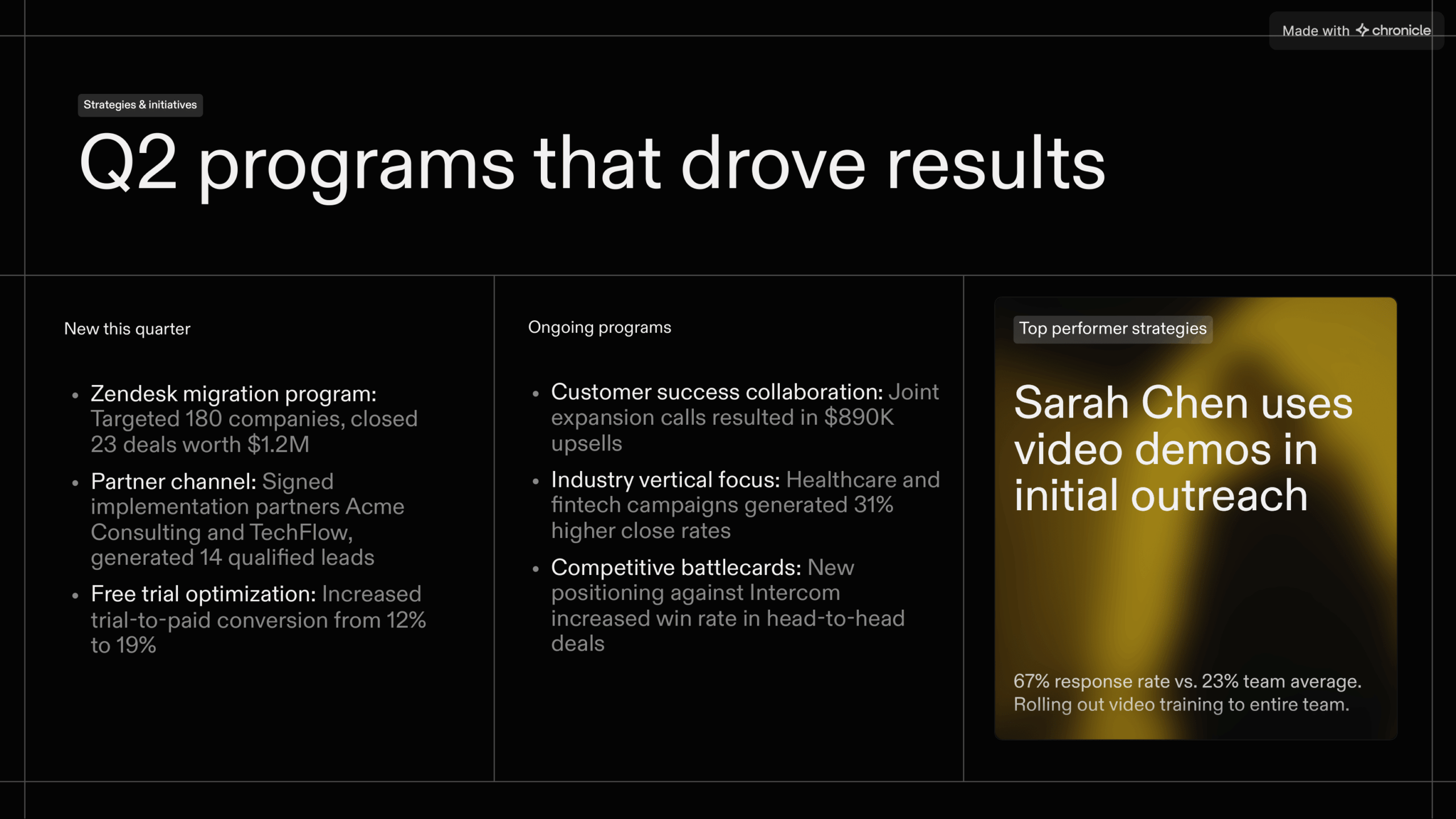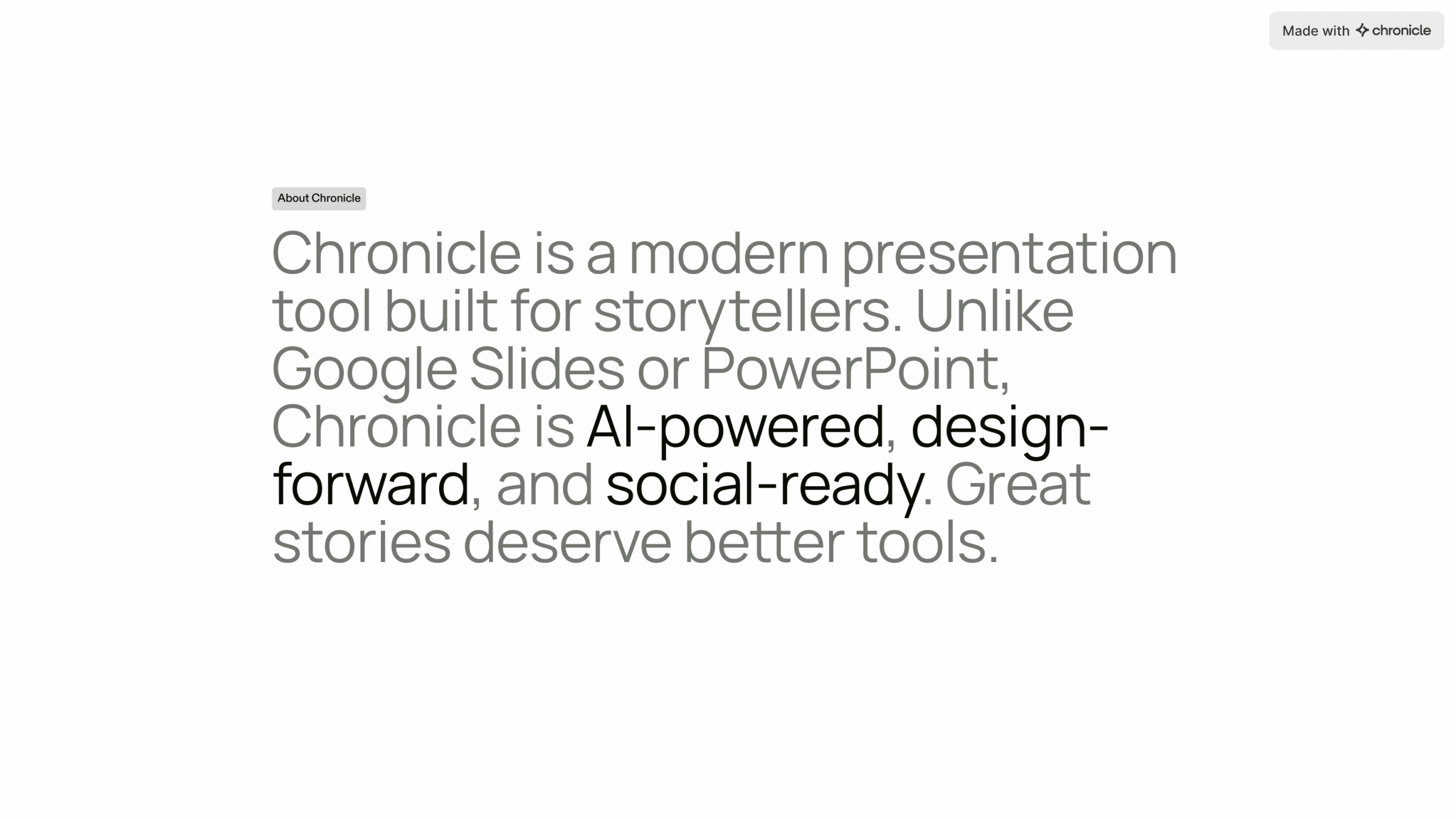 Chronicle brings powerful new ways to create, made for serious use cases for fast-moving, collaborative teams. With AI handling formatting and structure, you can go from notes to a finished deck in seconds. That means less time worrying about design, and more time refining your story.
