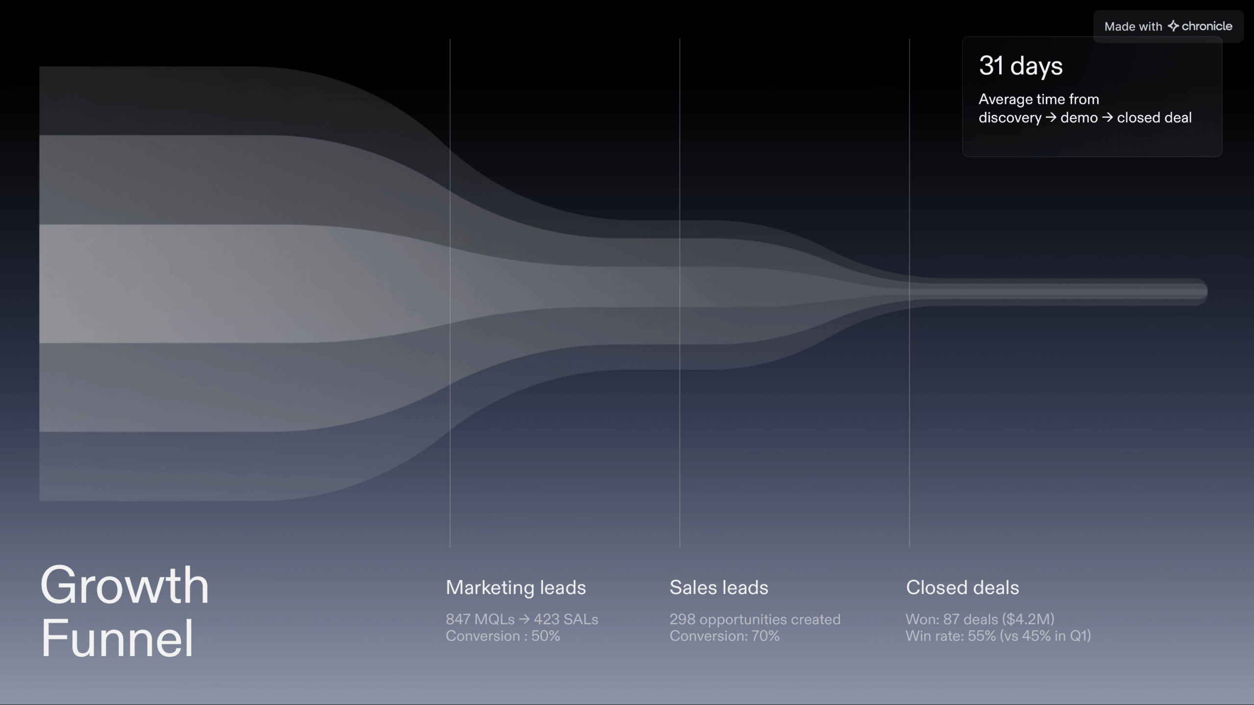 Never lose your audience’s attention. Chronicle organizes your content into a clear sequence: hook, problem, solution, proof; so your audience always knows where the story is going. Every good deck needs flow.