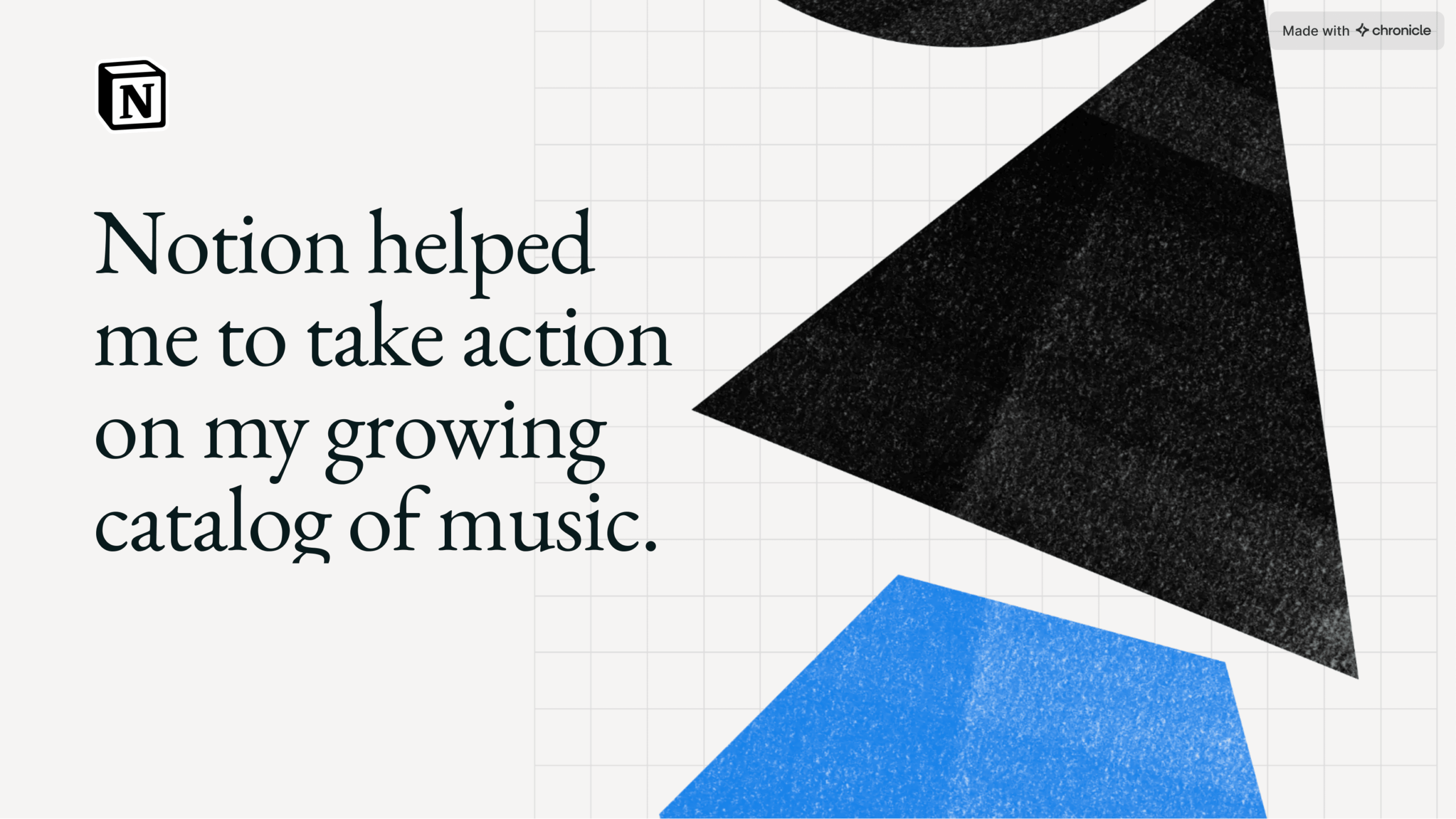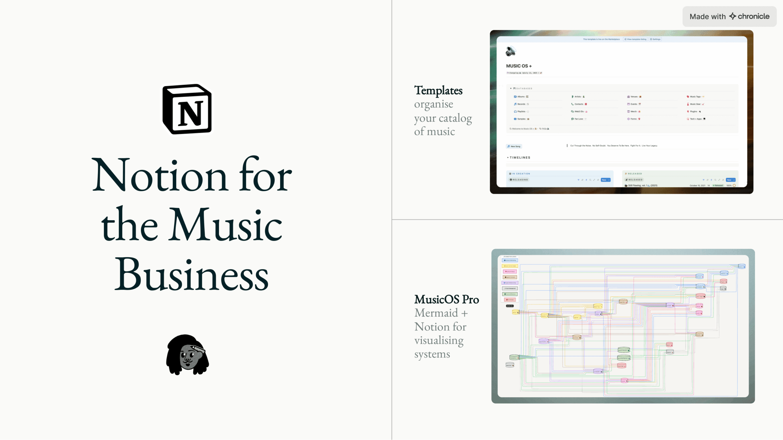 He used Chronicle’s layout flexibility to show how AI integrates into his creative flow, embedding live Notion databases, and creating a visual rhythm that mirrored his production style.