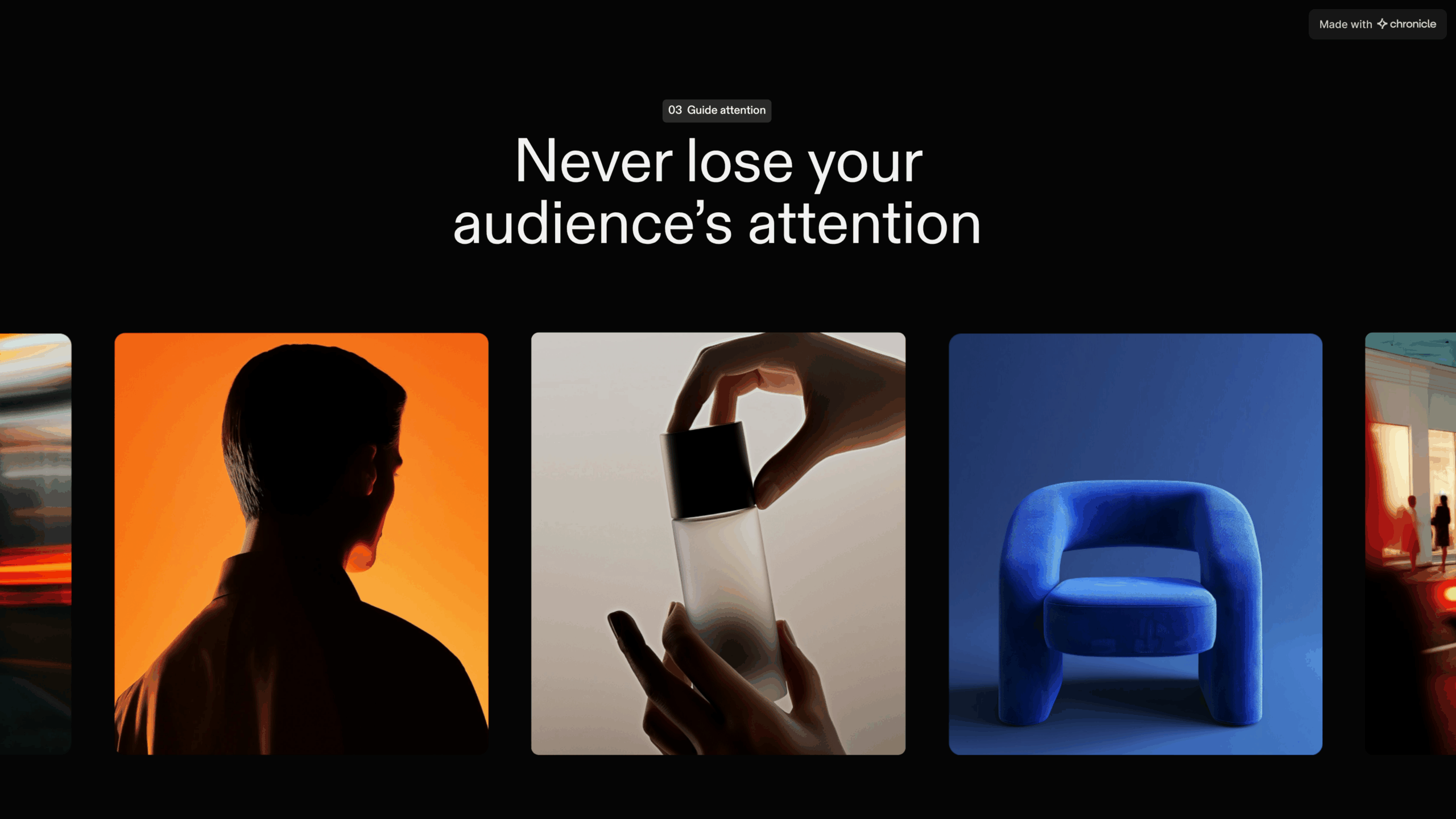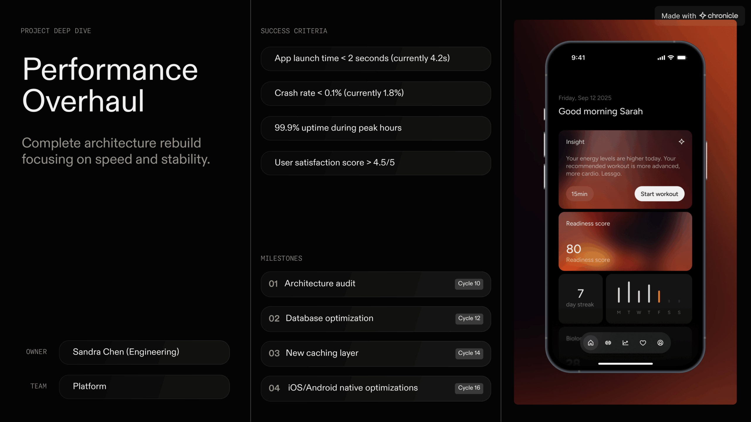 Product teams speak to many audiences: leadership, customers, cross-functional partners. Chronicle makes it simple to personalize the same deck for each, from high-level strategy to detailed feature specs.
