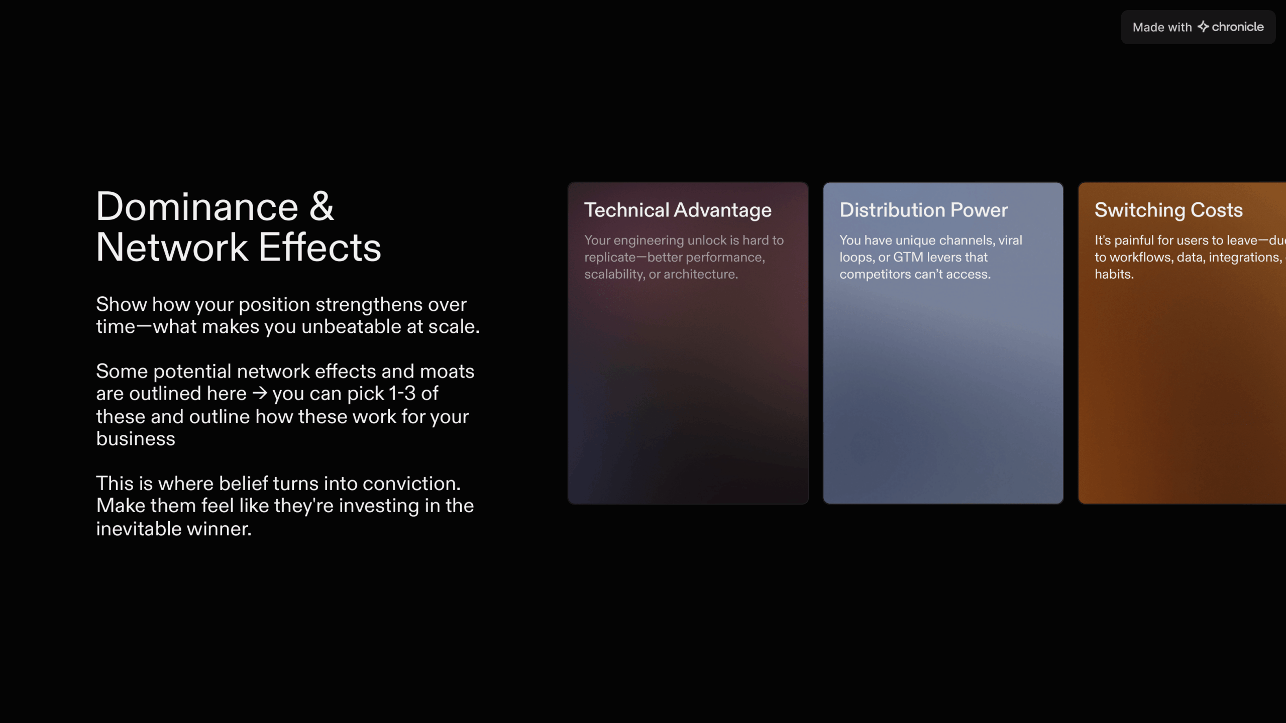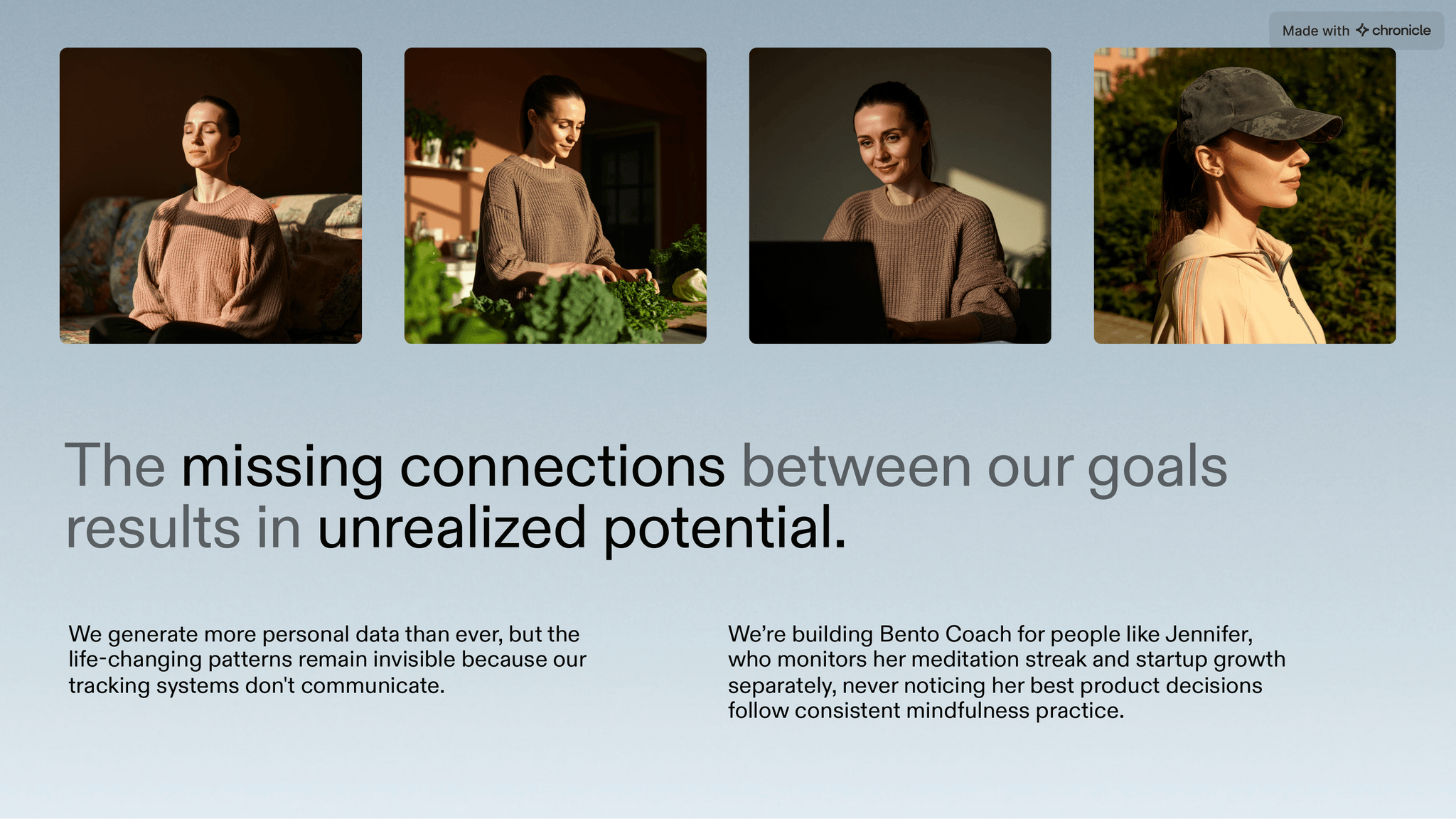 Chronicle helps product teams build clear, consistent decks that communicate the “why” behind product decisions — reducing misalignment and confusion.