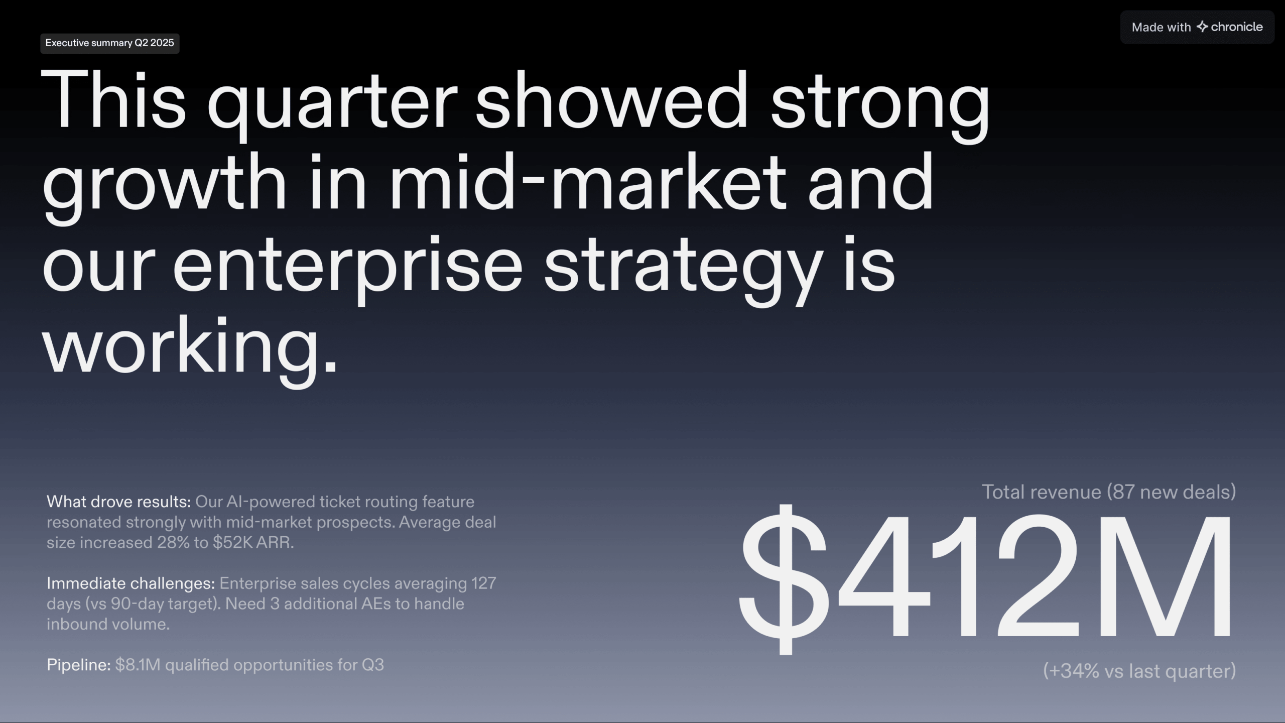 Chronicle automates design, saves time, and ensures brand consistency. Instead of manually formatting slides, your team can focus on closing deals.