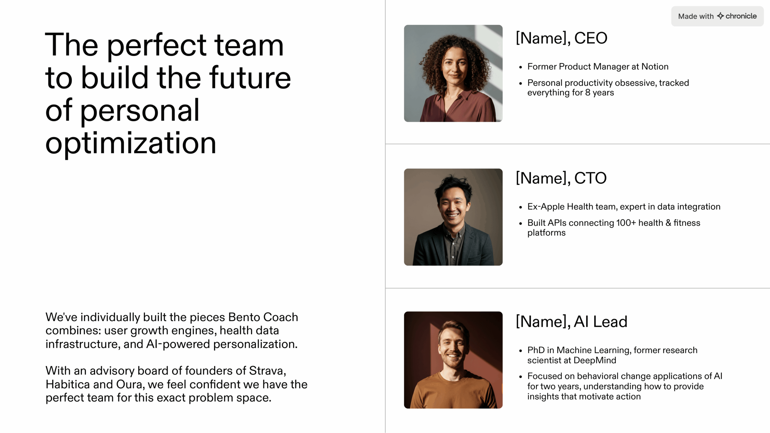 Chronicle automates design and branding, so you can focus on your startup’s growth and alignment instead of slide formatting.